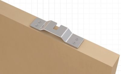 Presilha encaixada na folha. Para instalá-la é preciso fazer um corte de 20×16 mm na parte superior da folha (consultar manual de montagem). Este tipo de presilha permite que a porta deslize com apenas 0,5 mm de distância do trilho, para um acabamento mais minimalista.