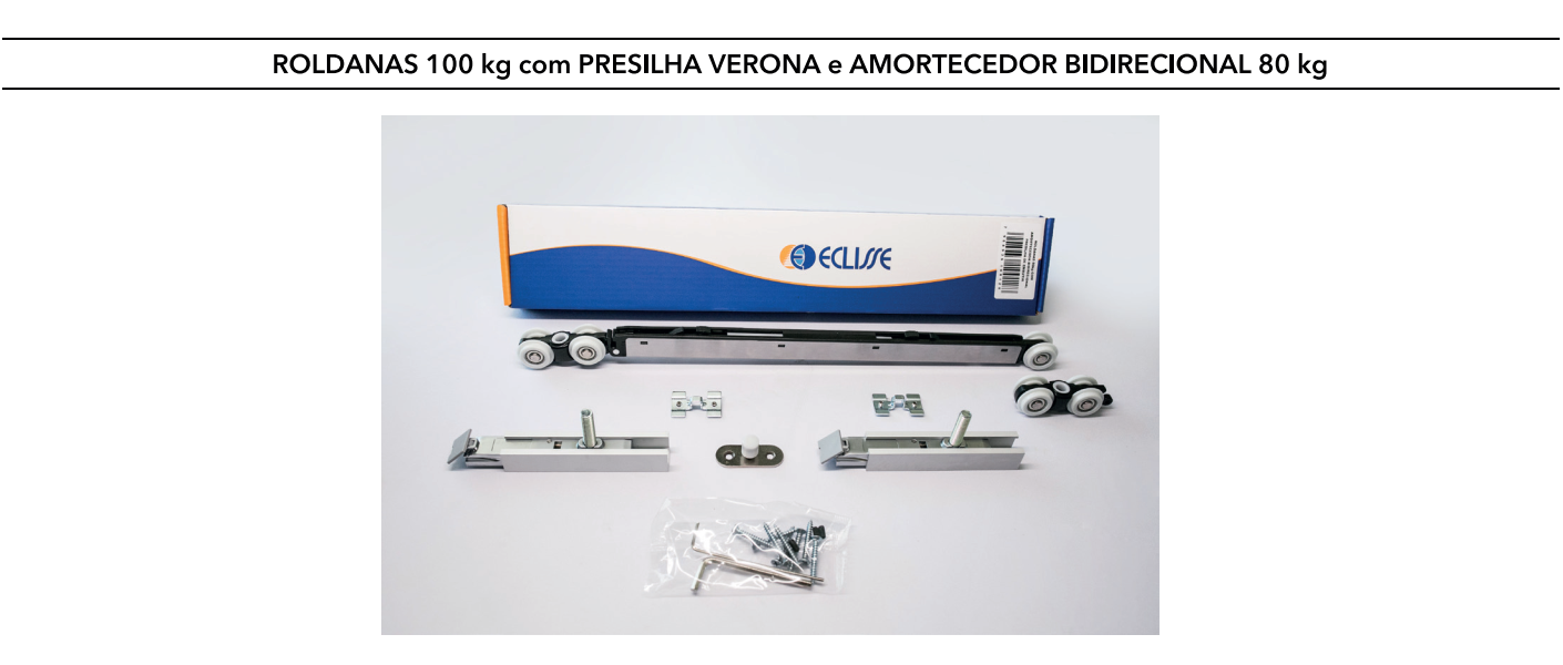 A ECLISSE desenvolveu uma série de soluções para portas de correr com roldanas que sustentam até 150 kg e presilhas que podem ser embutidas ou externas.O trilho superior, com somente 27 mm de largura e 37 mm de altura otimiza consequentemente o consumo de madeira e melhora o acabamento. Recebe não apenas roldanas de 100 com as de 150 kg.