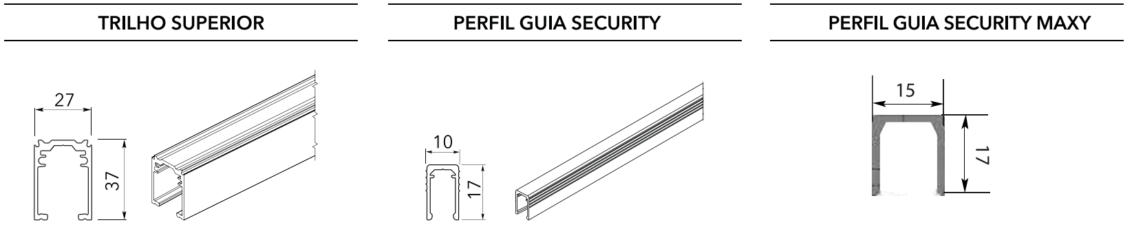 Alumínio natural, deve ser fixado na parte inferior da folha. Dimensionado para o pino guia em aço inox incluso em todas as roldanas. |